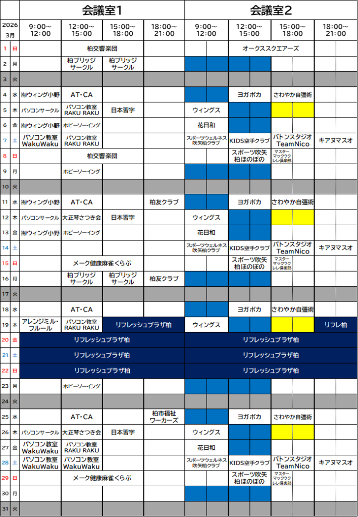 会議室1・2 団体抽選結果について-3月分- 2025 10/01 団体利用 会場貸出関係 平素よりリフレッシュプラザ柏をご利用頂き誠にありがとうございます。2026年3月分の団体抽選結果を掲載致します。下記の内容となりますのでご確認のほど宜しくお願い致します。 団体利用 会場貸出関係 URLをコピーしました! 2025年10月当日参加型レッスン 休講・代行のお知らせ 関連記事 多目的ホール 団体抽選結果について-3月分- 2025年10月1日 和室 団体抽選結果について-3月分- 2025年10月1日 多目的ホール 団体当選結果について-2月分- 2025年9月1日 会議室1・2 団体当選結果について-2月分- 2025年9月1日 和室 団体当選結果について-2月分- 2025年9月1日 多目的ホール 団体当選結果について-1月分- 2025年8月1日 和室 団体当選結果について-1月分- 2025年8月1日 会議室1・2 団体当選結果について-1月分- 2025年8月1日