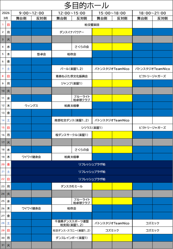 多目的ホール 団体抽選結果について-3月分- 2025 10/01 団体利用 会場貸出関係 平素よりリフレッシュプラザ柏をご利用頂き誠にありがとうございます。2026年3月分の団体抽選結果を掲載致します。下記の内容となりますのでご確認のほど宜しくお願い致します。 団体利用 会場貸出関係 URLをコピーしました! 2025年10月当日参加型レッスン 休講・代行のお知らせ 関連記事 会議室1・2 団体抽選結果について-3月分- 2025年10月1日 和室 団体抽選結果について-3月分- 2025年10月1日 多目的ホール 団体当選結果について-2月分- 2025年9月1日 会議室1・2 団体当選結果について-2月分- 2025年9月1日 和室 団体当選結果について-2月分- 2025年9月1日 多目的ホール 団体当選結果について-1月分- 2025年8月1日 和室 団体当選結果について-1月分- 2025年8月1日 会議室1・2 団体当選結果について-1月分- 2025年8月1日