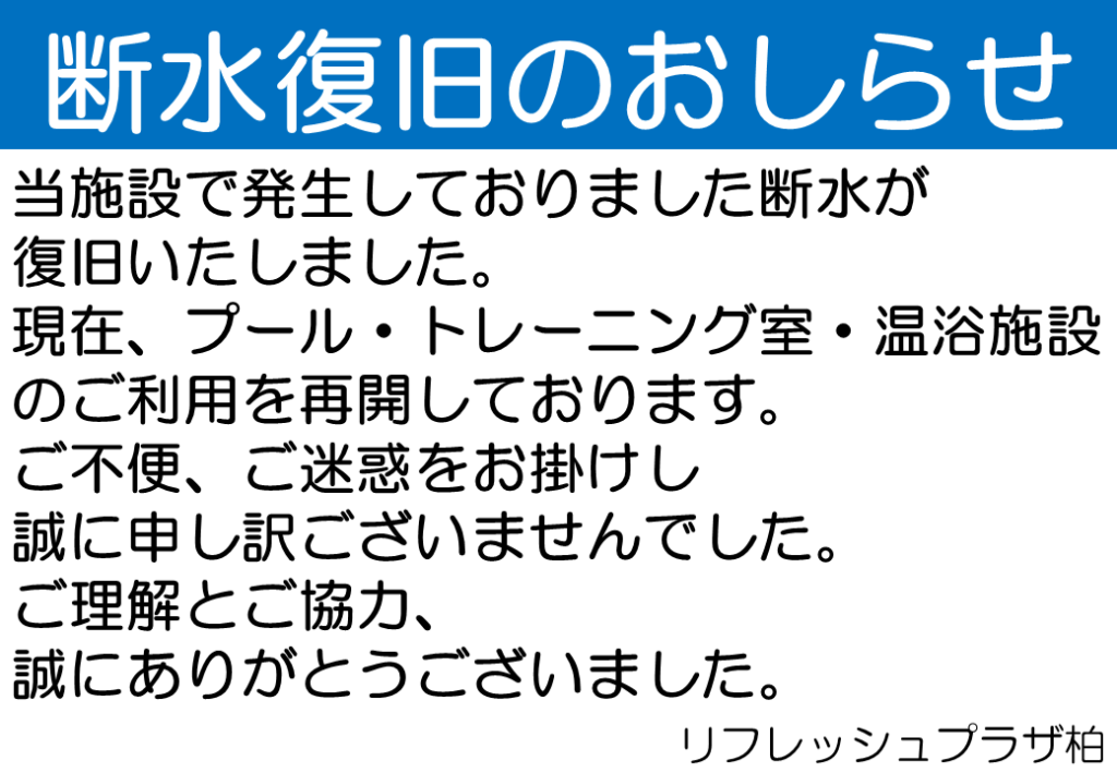 断水復旧ののお知らせ 2025 10/26 お知らせ お知らせ URLをコピーしました! 断水のお知らせ 関連記事 断水のお知らせ 2025年10月26日 2025年10月・11月当日参加型レッスン 休講・代行のお知らせ 2025年10月24日 南側(包括支援センター側)仮設足場設置のお知らせ 2025年10月24日 10/29(水) ZUMBA ハロウィンパーティーVer. 2025年10月23日 子どもプールの利用再開について 2025年10月23日 卓球台貸出休止のお知らせ 2025年10月20日 10月25日(土)🦇ハロウィンZUMBA🎃 2025年10月20日 子どもプール配管工事のお知らせ 2025年9月23日