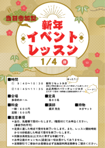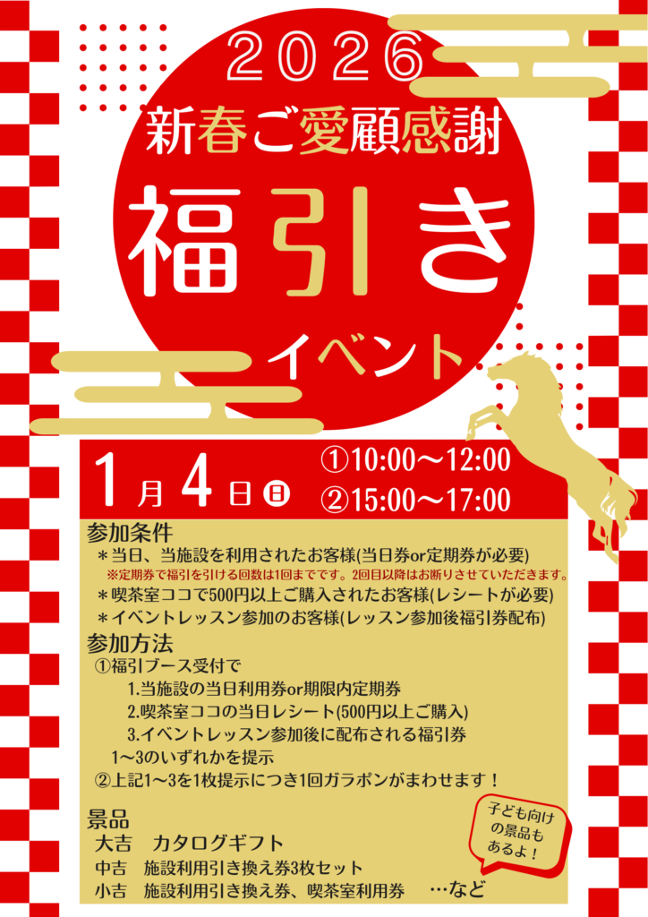 R8年1月4日(日)🎍福引イベント🐎 2025 12/15 イベント お知らせ イベント お知らせ URLをコピーしました! 2026年1月~3月開講🌸初心者向けプールプライベートレッスン 関連記事 R8年1月4日(日)🎍イベントレッスン🐎 2025年12月15日 第7期 医療用バランスボールレギュラーレッスン 2025年12月11日 2026年1月~3月開講🌸初心者向けプールプライベートレッスン 2025年12月11日 喫茶室ココ☕冬季メニュー&12/21イベント 2025年12月6日 12月22日(月)冬至🍊ボンタン湯 2025年12月5日 🎍子ども教室のお知らせ🐎 2025年12月1日 2026年1月5日(月)~3月30日(月)当日参加型レッスンスケジュール 2025年12月1日 温浴施設ご利用のお客様へ 2025年11月21日