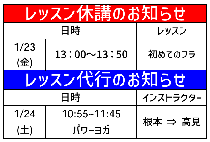 2026年1月当日参加型レッスン 休講・代行のお知らせ 2026 1/05 お知らせ スケジュール レッスン お知らせ スケジュール レッスン URLをコピーしました! 🐎新年、あけましておめでとうございます🎍 関連記事 🐎新年、あけましておめでとうございます🎍 2026年1月4日 敬老の日🍃施設利用優待券有効期限について 2025年12月22日 温浴施設 配管不具合のお知らせ 2025年12月20日 🐎子ども教室二次募集のお知らせ🐎 2025年12月17日 R8年1月4日(日)🎍イベントレッスン🐎 2025年12月15日 R8年1月4日(日)🎍福引イベント🐎 2025年12月15日 第7期 医療用バランスボールレギュラーレッスン 2025年12月11日 2026年1月~3月開講🌸初心者向けプールプライベートレッスン 2025年12月11日