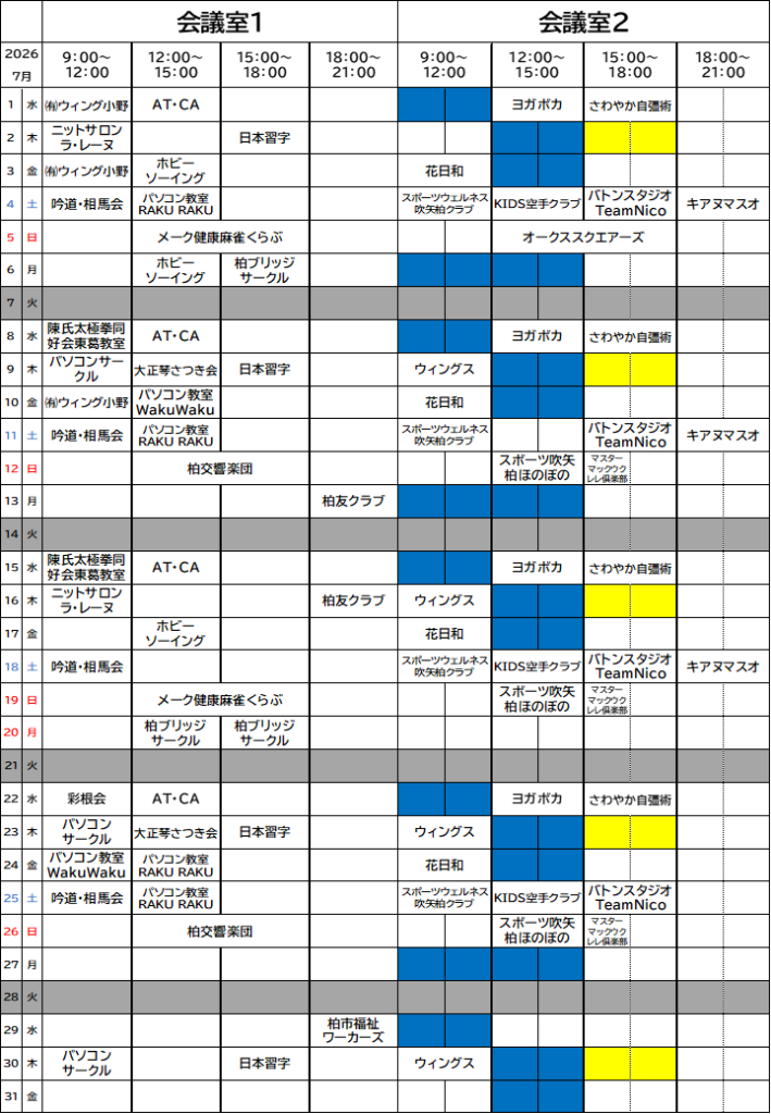 会議室1・2 団体当選結果について-7月分- 2026 2/01 お知らせ 団体利用 会場貸出関係 平素よりリフレッシュプラザ柏をご利用頂き誠にありがとうございます。2026年7月分の団体抽選結果を掲載致します。下記の内容となりますのでご確認のほど宜しくお願い致します。 お知らせ 団体利用 会場貸出関係 URLをコピーしました! 1/28水~2/9(月)卓球台貸出し休止のお知らせ 関連記事 多目的ホール 団体当選結果について-7月分- 2026年2月1日 和室 団体当選結果について-7月分- 2026年2月1日 2026年2月当日参加型レッスン 休講・代行のお知らせ 2026年2月1日 1/28水~2/9(月)卓球台貸出し休止のお知らせ 2026年1月21日 2026年1月当日参加型レッスン 休講・代行のお知らせ 2026年1月5日 和室 団体抽選結果について-6月分- 2026年1月4日 🐎新年、あけましておめでとうございます🎍 2026年1月4日 多目的ホール 団体抽選結果について-6月分- 2026年1月4日