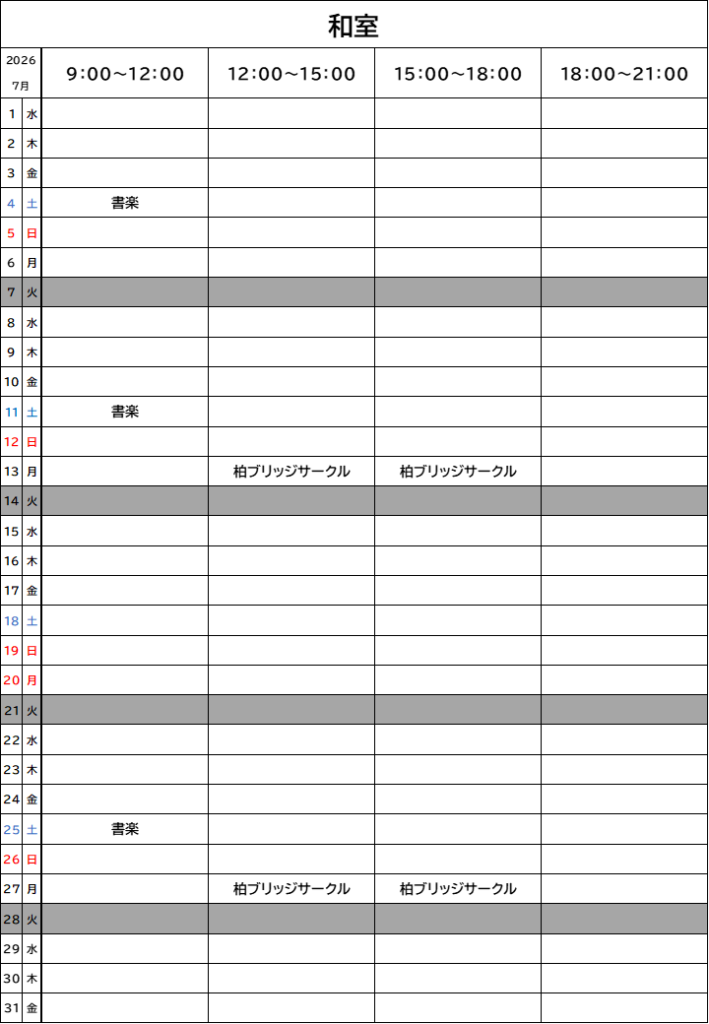和室 団体当選結果について-7月分- 2026 2/01 お知らせ 団体利用 会場貸出関係 平素よりリフレッシュプラザ柏をご利用頂き誠にありがとうございます。2026年7月分の団体抽選結果を掲載致します。下記の内容となりますのでご確認のほど宜しくお願い致します。 お知らせ 団体利用 会場貸出関係 URLをコピーしました! 1/28水~2/9(月)卓球台貸出し休止のお知らせ 関連記事 多目的ホール 団体当選結果について-7月分- 2026年2月1日 会議室1・2 団体当選結果について-7月分- 2026年2月1日 2026年2月当日参加型レッスン 休講・代行のお知らせ 2026年2月1日 1/28水~2/9(月)卓球台貸出し休止のお知らせ 2026年1月21日 2026年1月当日参加型レッスン 休講・代行のお知らせ 2026年1月5日 和室 団体抽選結果について-6月分- 2026年1月4日 🐎新年、あけましておめでとうございます🎍 2026年1月4日 多目的ホール 団体抽選結果について-6月分- 2026年1月4日