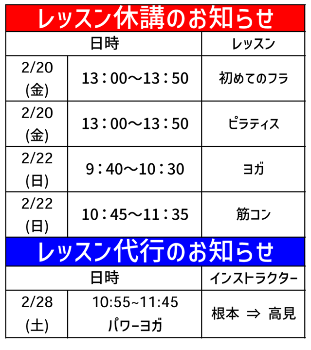 2026年2月当日参加型レッスン 休講・代行のお知らせ