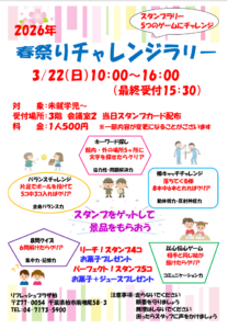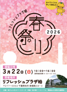 2026年3月22日(日)春祭り🌸チャレンジラリー🌸 2026 2/21 イベント お知らせ イベント お知らせ URLをコピーしました! 🌸2026 春休み子ども水泳教室体験会🌸 関連記事 2026年3月22日(日)春祭り🌸チャレンジラリー🌸 2026年2月21日 2026年3月22日(日)🌸リフレッシュプラザ柏春祭り🌸開催✨✨ 2026年2月21日 2026年3月22日(日)春祭り🌸子どもフロア教室体験イベント🌸 2026年2月21日 2026年3月22日(日)春祭り🌸当日参加型イベントレッスン🌸 2026年2月21日 温浴施設・臨時休止のお知らせ 2026年2月4日 多目的ホール 団体当選結果について-7月分- 2026年2月1日 和室 団体当選結果について-7月分- 2026年2月1日 会議室1・2 団体当選結果について-7月分- 2026年2月1日