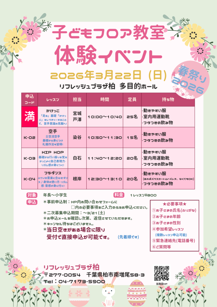 2026年3月22日(日)春祭り🌸子どもフロア教室体験イベント二次募集受付中🌸 2026 3/11 イベント お知らせ こども向け教室 レッスン イベント お知らせ こども向け教室 レッスン URLをコピーしました! 2026年3月当日参加型レッスン🌸休講・代行のお知らせ 関連記事 2026年3月当日参加型レッスン🌸休講・代行のお知らせ 2026年3月6日 第8期 医療用バランスボールレギュラーレッスン 2026年3月5日 子ども水泳🌸春の体験会🌸二次募集のお知らせ 2026年3月3日 🌸子ども教室のお知らせ🌸 2026年3月1日 シュノーケリング教室4月~6月開催✨ 2026年3月1日 和室 団体当選結果について-8月分- 2026年3月1日 会議室1・2 団体当選結果について-8月分- 2026年3月1日 多目的ホール 団体当選結果について-8月分- 2026年3月1日