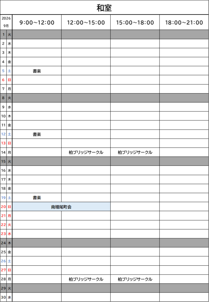 和室 団体当選結果について-9月分- 2026 4/01 お知らせ 団体利用 会場貸出関係 平素よりリフレッシュプラザ柏をご利用頂き誠にありがとうございます。2026年9月分の団体抽選結果を掲載致します。下記の内容となりますのでご確認のほど宜しくお願い致します。 お知らせ 団体利用 会場貸出関係 URLをコピーしました! 🌸子ども教室二次募集のお知らせ🌸 関連記事 多目的ホール 団体当選結果について-9月分- 2026年4月1日 会議室1・2 団体当選結果について-9月分- 2026年4月1日 2026年4月当日参加型レッスン🌸休講・代行のお知らせ 2026年4月1日 🌸子ども教室二次募集のお知らせ🌸 2026年3月18日 2026年4月1日(水)~7月19日(金)プール&フロア当日参加型レッスンスケジュールのご案内 2026年3月16日 2026年3月22日(日)春祭り🌸子どもフロア教室体験イベント二次募集受付中🌸 2026年3月11日 第8期 医療用バランスボールレギュラーレッスン 2026年3月5日 シュノーケリング教室4月~6月開催✨ 2026年3月1日