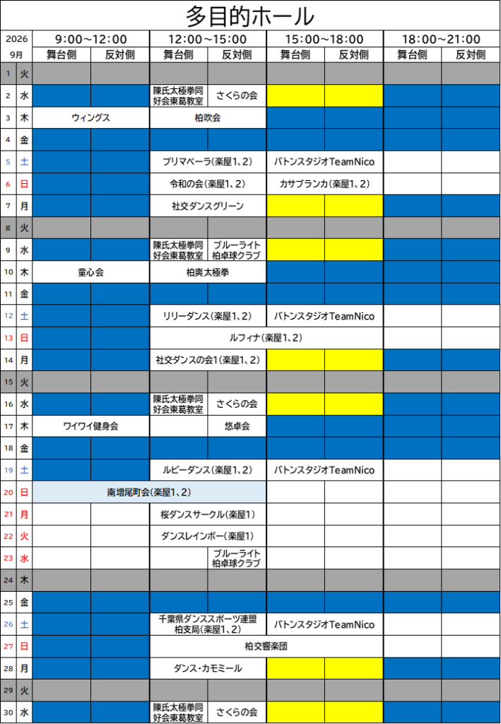 多目的ホール 団体当選結果について-9月分- 2026 4/01 お知らせ 団体利用 会場貸出関係 平素よりリフレッシュプラザ柏をご利用頂き誠にありがとうございます。2026年9月分の団体抽選結果を掲載致します。下記の内容となりますのでご確認のほど宜しくお願い致します。 お知らせ 団体利用 会場貸出関係 URLをコピーしました! 🌸子ども教室二次募集のお知らせ🌸 関連記事 会議室1・2 団体当選結果について-9月分- 2026年4月1日 和室 団体当選結果について-9月分- 2026年4月1日 2026年4月当日参加型レッスン🌸休講・代行のお知らせ 2026年4月1日 🌸子ども教室二次募集のお知らせ🌸 2026年3月18日 2026年4月1日(水)~7月19日(金)プール&フロア当日参加型レッスンスケジュールのご案内 2026年3月16日 2026年3月22日(日)春祭り🌸子どもフロア教室体験イベント二次募集受付中🌸 2026年3月11日 第8期 医療用バランスボールレギュラーレッスン 2026年3月5日 シュノーケリング教室4月~6月開催✨ 2026年3月1日