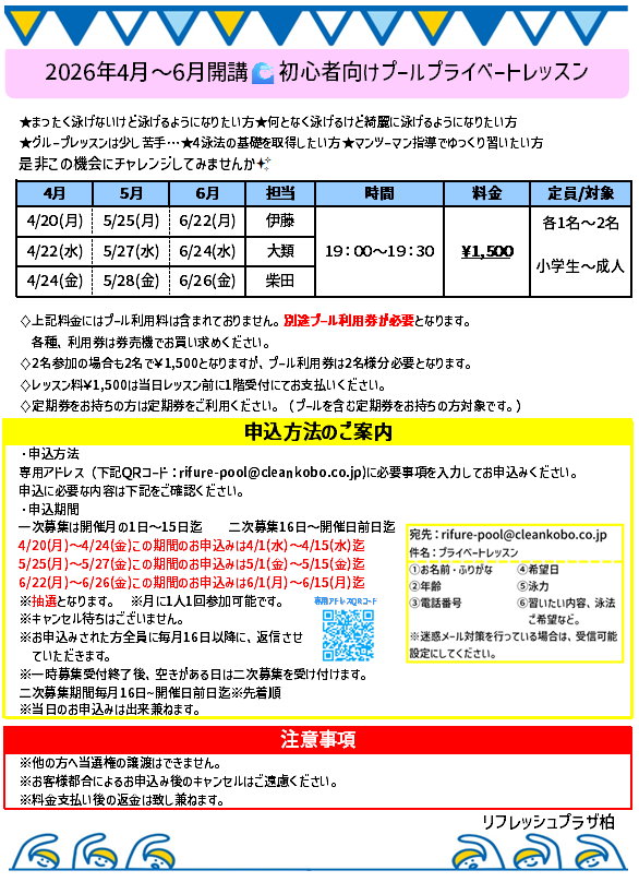 平素よりリフレッシュプラザ柏をご利用いただきありがとうございます。 4月~6月プール初心者プライベートレッスンのお知らせです。 皆様のご応募、心よりお待ちしております。 詳細は以下をご確認ください。 -