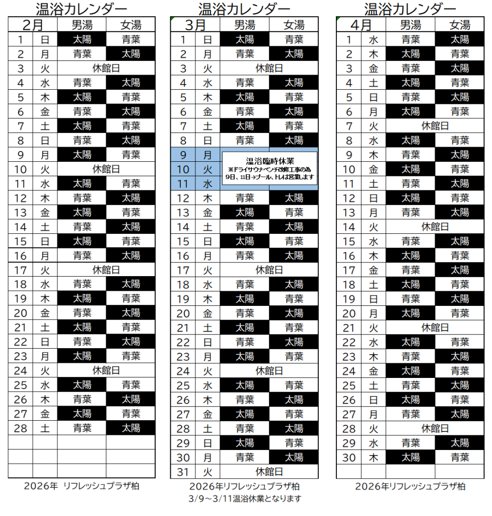 毎日、青葉の湯と太陽の湯が入れ替わり楽しめます。